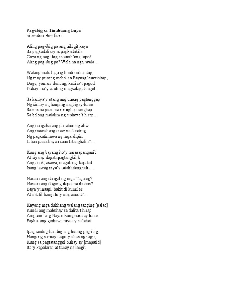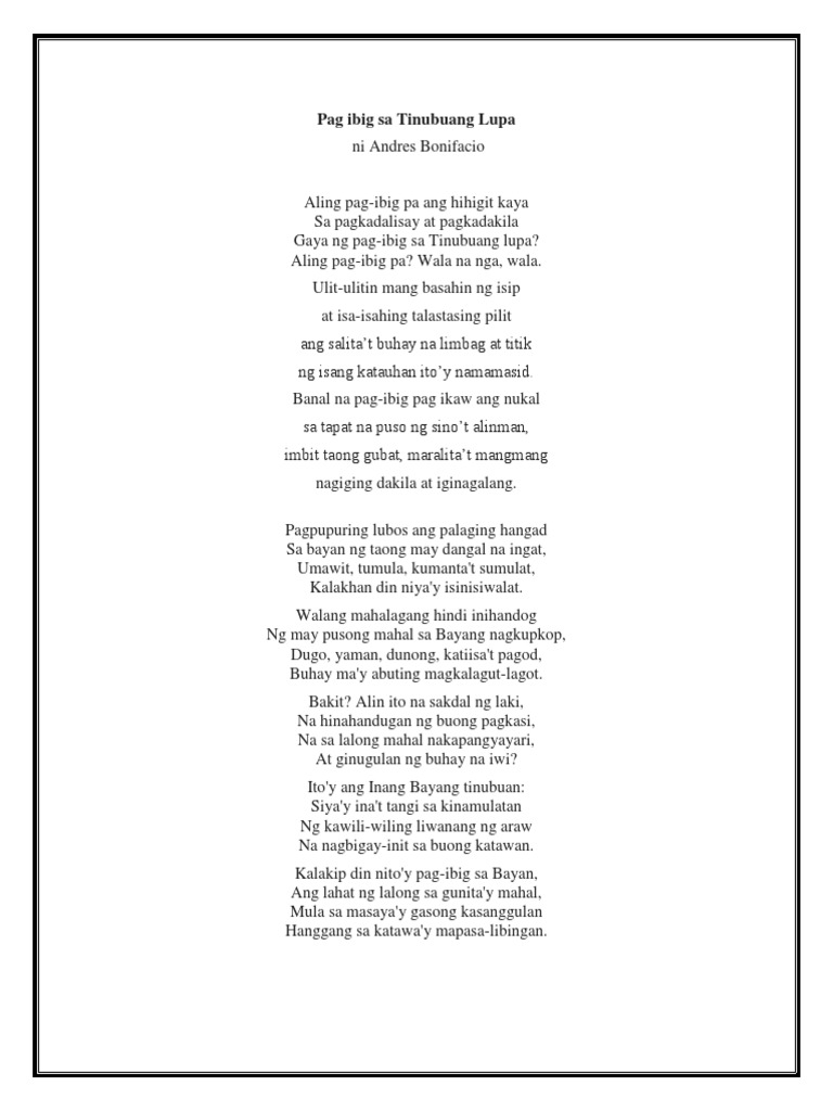 Filz Docx Pag Ibig Sa Tinubuang Lupa Ni Andres Bonifacio 1 Aling Pag Ibig Pa Ang Hihigit Kaya Sa Pagkadalisay At Pagkadakila Gaya Ng Pag Ibig Sa Course Hero from www.coursehero.com The said poem was published in the first issue of kalayaan. The said poem was published in the first issue of kalayaan. Love for one's homeland) is a poem written by hero andres bonifacio. Learn vocabulary, terms and more with flashcards, games and other study tools. Here are 3 possible meanings. Si bonifacio ay mas magaling na mandirigma kaysa sa isang manunulat ngunit pinatunayan niya na kaya niyang gumawa ng isang tula para sa kanyang. Pagibig sa tinubuang lupa poem analysis. Love for one's homeland) is a poem written by hero andres bonifacio.