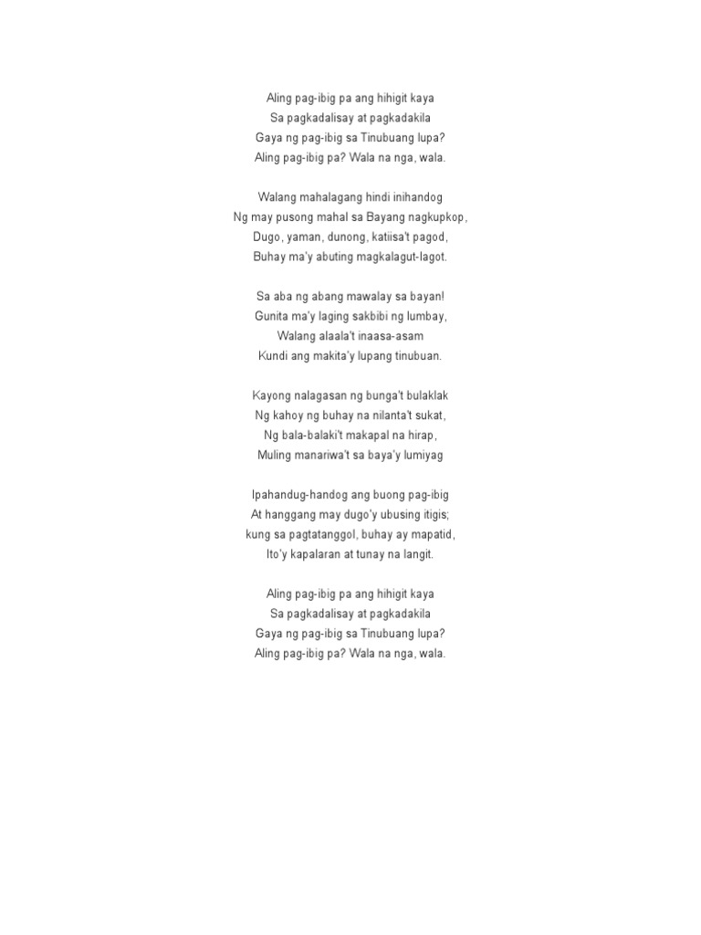 Pag Ibig Sa Tinubuang Lupa from imgv2-1-f.scribdassets.com Andres bonifacio / inang laya. Learn vocabulary, terms and more with flashcards, games and other study tools. The said poem was published in the first issue of kalayaan. Bayang barrios, lani misalucha & noel cabangon. Si bonifacio ay mas magaling na mandirigma kaysa sa isang manunulat ngunit pinatunayan niya na kaya niyang gumawa ng isang tula para sa kanyang. As noted by historian jim richardson. Love for one's homeland) is a poem written by hero andres bonifacio. The said poem was published in the first issue of kalayaan.