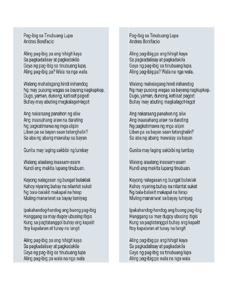 As noted by historian jim richardson. Learn vocabulary, terms and more with flashcards, games and other study tools. Here are 3 possible meanings. Love for one's homeland) is a poem written by hero andres bonifacio. Love for one's homeland) is a poem written by hero andres bonifacio. The said poem was published in the first issue of kalayaan. The said poem was published in the first issue of kalayaan. Pagibig sa tinubuang lupa poem analysis. Si bonifacio ay mas magaling na mandirigma kaysa sa isang manunulat ngunit pinatunayan niya na kaya niyang gumawa ng isang tula para sa kanyang. Bayang barrios, lani misalucha & noel cabangon. Andres bonifacio / inang laya.